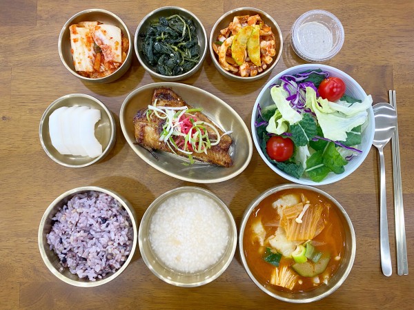 깻잎순나물/ 김치/ 계절샐러드/ 참외