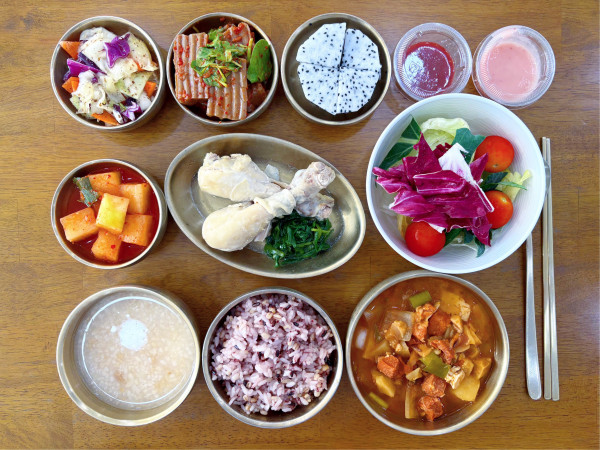 잡곡밥/ 누룽지/ 고추장찌개/ 닭수육&부추찜/