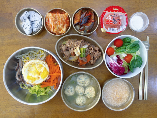 비빔밥/ 굴림만두국/ 소불고기/ 가지볶음/
