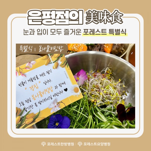 은평점만의 美味食(특별메뉴) 안녕하세요 포레스트입니다 :)! 최근 은평 포레스트한방병원의 밥이 맛있다고 소문이 자자하게 났습니다~ 쉐프님이 직접 만들어주시는 이탈리아식 푸딩부터 '경칩' 기념 봄나물 비빔밥까지! 환우분들의 건강과 힐링에 아낌없는 투자를 하는 은평 포레스트한방병원입니다 :) 목록