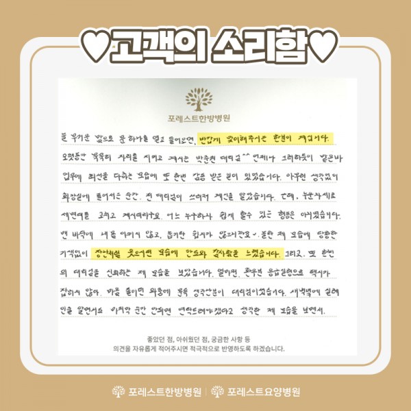 포레스트-고객의소리함 포레스트에 전달된 고객의 소리입니다❣ 겸근은 사람을 머물게하고, 칭찬은 사람을 가볍게하고, 넓음은 사람을 따르게하고, 깊음은 사람을 감동케 한다. (다산 정약용 명언) 감동적인 글귀와 함께 시설관리팀 박준원대리님을 향한 칭찬의 메세지를 보내주셨는데요. 앞으로도 포레스트에서 겪으시는 모든 서비스에 더 만족하실수 있도록 임직원 모두 열심히 하겠습니다. 좋은말씀 감사합니다. 목록