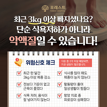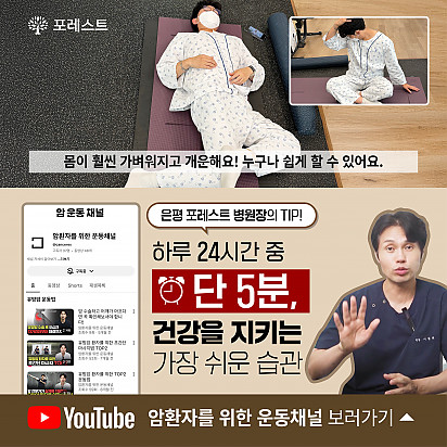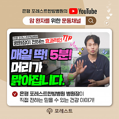 자궁내막암 3기, 박지혜 환우님의 희망일지 ep_1 | 포레스트 환우 이야기 2024.08.08 자궁내막암 3기, 박지혜 환우님의 희망일지 ep_2 | 포레스트 환우 이야기 2024.08.08 자궁내막암 3기, 박지혜 환우님의 희망일지 ep_3 | 포레스트 환우 이야기 2024.08.08 폐암 4기(비소세포암), 서중원 환우님의 희망일지 ep_1 | 포레스트 환우 이야기 2024.08.08 폐암 4기(비소세포암), 서중원 환우님의 희망일지 ep_2 | 포레스트 환우 이야기 2024.08.08 폐암 4기(비소세포암), 서중원 환우님의 희망일지 ep_3 | 포레스트 환우 이야기 2024.08.08 Hot 포레스트의 악액질(Cachexia) 검사와 치료 암 진단을 받고 항암치료 중이거나 수술 후 요양 중이신 분들이라면 잘 먹어도 갑자기 몸무게가 확 빠지는 경험이 있… 2025.10.30 Hot [암환자를 위한 운동 채널] 소개합니다! “영상으로 함께 회복을 시작하세요!” 원내에서도, 집에서도 안전하게 따라할 수 있는 [암환자를 위한 운동 채널]… 2025.10.27 Hot 은평 포레스트 리모델링 소식 은평 포레스트가 환자분들의 치료와 회복에 최적화된 공간으로 새로워집니다. Coming Soon … 2025.10.20 Hot 자연이 주는 보약, 제철 식단 자연이 주는 보약, 제철 식단 가을에 나는 음식은 가을에 먹어야 합니다. 가장 영양이 풍부한 제철 식재료로 몸… 2025.10.10 Hot 힐링미 앱의 은평 포레스트 입원 환우 후기 전국 암요양병원 상담 앱 힐링미에서 인정받은 포레스트 입원 환우 후기 포레스트는 환자 한 분, 한 분의 이야기에 귀 기… 2025.10.02 Hot 포레스트 10월 휴진 안내 안녕하세요, 포레스트입니다. 다가오는 10월 은평점 휴진 일정을 미리 알려드리오니 내원과 예약에 참고하시길 바랍니다. 언… 2025.09.22 Hot 작은 감기도 크게 번질 수 있는 암 환자의 환절기 건강수칙 작은 감기도 크게 번질 수 있는 암 환자의 환절기 건강수칙 환절기에는 큰 일교차와 건조한 공기로 호흡기 질환이 늘어나… 2025.09.17 Hot 포레스트 힐링 운동 프로그램 포레스트는 환우분들의 건강한 일상을 위해 운동 프로그램을 운영하고있습니다. ✅ 왜 운동이 필요할까요? 항암 치료 과정에… 2025.09.09 Hot [뇌종양 환자를 위한 운동법] 기억력 감소, 브레인포그. 이거 하나면 충분합니다. 두통, 어지럼증, 불안… 뇌종양 환자라면 매일 마주하는 어려움이죠. 은평 포레스트한방병원 이철희병원장님의 단 5분, 간… 2025.09.05 12345 Search 검색대상 제목 내용 제목+내용 회원아이디 회원아이디(코) 글쓴이 글쓴이(코) 검색어 필수