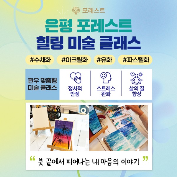 은평 포레스트 힐링 미술 클래스 358https://foresthospital.co.kr/eunp/main/sub06_04.html [은평 포레스트 힐링 미술 클래스를 소개합니다] 말로 다 하지 못한 감정들, 붓을 들고 천천히 그려내보아요:) 포레스트 은평의 미술치료는 내면을 돌아보고 스스로를 위로하는 특별한 시간이에요 따뜻한 분위기 속에서 마음 깊숙한 곳에 숨어있던 이야기들이 하나하나 색으로 피어나지요. 오늘 하루, 포레스트와 함께 내 마음의 이야기에 귀 기울여 보세요.♥ 목록