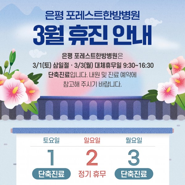 다가오는 3월 1일(토) 삼일절 및 3월 3일(월) 대체공휴일 진료 일정을 안내드립니다.