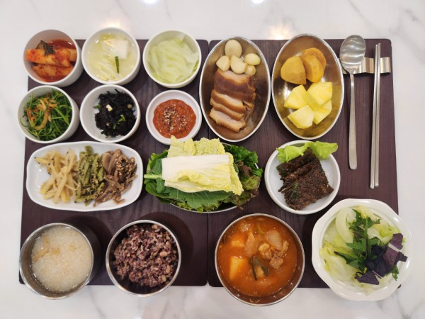 2월 19일 항암식단 [2/19 수요일 중식] 잡곡밥/누룽지/감자짜글이/족발&쌈채소,숙채/ 건파래무침/세발나물겉절이/도토리전(라이브)/ 궁채*도라지*토란대나물/양배추쌈/ 김치&물김치/계절샐러드/파인애플&감 목록