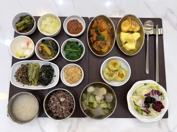 1월 24일 항암식단 [1/24 금요일 중식] 잡곡밥/누룽지/토란국/돈사태찜/궁중잡채/ 케일숙쌈&강된장/애호박전(라이브)/ 고구마순나물*궁채나물*건곤드레나물/ 양배추쌈/김치&물김치/계절샐러드/ 파인애플*감 목록