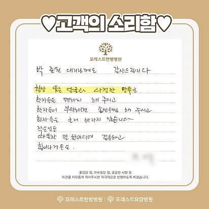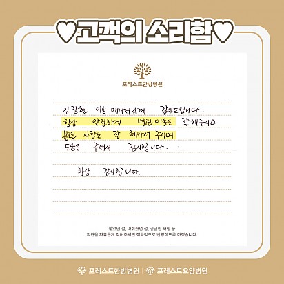 자궁내막암 3기, 박지혜 환우님의 희망일지 ep_1 | 포레스트 환우 이야기 2024.08.08 자궁내막암 3기, 박지혜 환우님의 희망일지 ep_2 | 포레스트 환우 이야기 2024.08.08 자궁내막암 3기, 박지혜 환우님의 희망일지 ep_3 | 포레스트 환우 이야기 2024.08.08 폐암 4기(비소세포암), 서중원 환우님의 희망일지 ep_1 | 포레스트 환우 이야기 2024.08.08 폐암 4기(비소세포암), 서중원 환우님의 희망일지 ep_2 | 포레스트 환우 이야기 2024.08.08 폐암 4기(비소세포암), 서중원 환우님의 희망일지 ep_3 | 포레스트 환우 이야기 2024.08.08 Hot 포레스트 통합 암 센터 정용철원장님 포레스트한방병원 강동점에 통합 암 센터 정용철원장님을 소개합니다. "공감과 소통을 통해 치료하겠습니다" 공감과 소통이 … 2023.08.08 Hot 포레스트 운동프로그램 포레스트한방병원 강동 최원식물리치료팀장님의 운동프로그램입니다. 포레스트 인기만점 운동프로그램을 퇴원후에 집에서도 따라 하실… 2023.08.03 Hot 8월 힐링프로그램 포레스트한방병원 강동 8월 힐링프로그램 안내입니다. -영상스트레치 -항암영양교육 -원데이클래스 -취미·공예 DIY … 2023.08.01 Hot 포레스트 “종근당건강 캔서코치” 관능평가(맛 선호도 평가) 협업 포레스트한방병원·요양병원은 “종근당건강 캔서코치” 관능평가(맛 선호도 평가) 협업을 통한 암 환자용 영양조제식품 개발에 기여했… 2023.07.26 Hot 고객의 소리함 포레스트한방병원 강동, 포레스트요양병원 강남에 전달 된 고객의 소리함 내용입니다. 1. 이현경 간호사님을 칭찬합니… 2023.07.18 Hot 포레스트 평창 전용농장 포레스트 건강한 식단의 비결은 평창농장에 신선한 유기농 식재료에서 나옵니다. 암 환자에게 음식이란 치료만큼이나 중요합니… 2023.07.14 Hot 포레스트만의 특별한 컨시어지 서비스 포레스트에서 제공하는 특별한 컨시어지 서비스를 누려보세요! - 전자기기 사용법 - 메일전송 - 인쇄 및 복사 등의 생활… 2023.07.11 Hot 7월 힐링프로그램 포레스트 7월의 힐링프로그램 소식입니다. 7월에는 포레스트한방병원 강동에 새롭게 추가된 항암 영양교육도 들어 보실 수 … 2023.07.05 Hot 고객의 소리함 포레스트한방병원 강동에 전달된 고객의 소리함입니다! 1. 박준원 대리님께 감사드립니다. 항상 웃는 얼굴과 다정한 말… 2023.07.04 1617181920 Search 검색대상 제목 내용 제목+내용 회원아이디 회원아이디(코) 글쓴이 글쓴이(코) 검색어 필수
