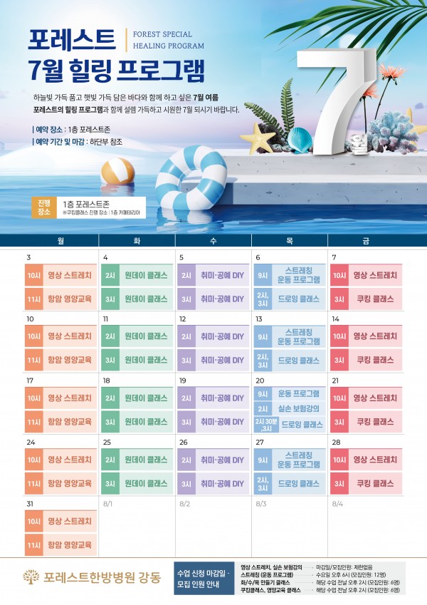 7월 힐링프로그램 포레스트 7월의 힐링프로그램 소식입니다. 7월에는 포레스트한방병원 강동에 새롭게 추가된 항암 영양교육도 들어 보실 수 있답니다! 알차게 준비된 포레스트 힐링프로그램과 함께~! 무더위를 싹~ 날리시길 바랍니다 :) 목록