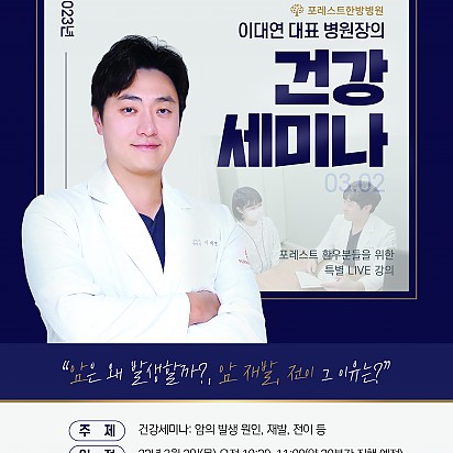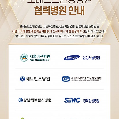 자궁내막암 3기, 박지혜 환우님의 희망일지 ep_1 | 포레스트 환우 이야기 2024.08.08 자궁내막암 3기, 박지혜 환우님의 희망일지 ep_2 | 포레스트 환우 이야기 2024.08.08 자궁내막암 3기, 박지혜 환우님의 희망일지 ep_3 | 포레스트 환우 이야기 2024.08.08 폐암 4기(비소세포암), 서중원 환우님의 희망일지 ep_1 | 포레스트 환우 이야기 2024.08.08 폐암 4기(비소세포암), 서중원 환우님의 희망일지 ep_2 | 포레스트 환우 이야기 2024.08.08 폐암 4기(비소세포암), 서중원 환우님의 희망일지 ep_3 | 포레스트 환우 이야기 2024.08.08 Hot [포레스트 협력병원안내] ✔포레스트한방병원: 서울아산병원, 삼성서울병원, 세브란스병원, 가톨릭대학교서울성모병원, 강남세브란스병원, 강북삼성병원, 건… 2023.03.21 Hot 포레스트&의료법인 케이아이카이 그룹 MOU 체결 포레스트와 일본의 의료법인 케이아이카이 그룹이 MOU를 체결했습니다. 케이아이카이 그룹은 일본 도쿄, 오사카, 나라에서 BE… 2023.03.16 Hot 포레스트 이대연 대표 병원장의 건강 세미나 포레스트 환우분들만을 위한 포레스트 이대연 대표 병원장의 건강 세미나가 진행되었습니다. 평소 암재발,전이에 관한 내용에 … 2023.03.14 Hot 3월 포레스트 힐링프로그램 산뜻한 봄의 시작 3월이 되었습니다.^^ 봄바람이 살랑살랑 불어오는 3월에는 활짝 피어나는 예쁜 봄꽃처럼 포레스트 힐… 2023.03.02 Hot 이대연 대표 병원장님의 건강세미나 이번주! 포레스트한방병원·요양병원 환우분들을 위한 이대연 대표 병원장님의 건강세미나가 진행 될 예정입니다! 암의 발생… 2023.02.27 Hot 포레스트 의료진소개 프리미엄 진료 서비스를 제공하는, 포레스트한방병원·요양병원 의료진 소개입니다. 포레스트의 모든 의료진들은 "환자 치료에… 2023.02.24 Hot 포레스트-고객의소리함 포레스트에 전달된 고객의 소리입니다❣ 겸근은 사람을 머물게하고, 칭찬은 사람을 가볍게하고, 넓음은 사람을 따르게하고, … 2023.02.21 Hot 쿠킹클래스-연어샐러드 2월 2일 진행된 포레스트 쿠킹클래스에서는 연어샐러드를 만들어 보았습니다. 연어에 함유되어 있는 EPA, DHA는 오… 2023.02.14 Hot 포레스트 직원 교육 강의 매주 포레스트한방병원·요양병원에서 진행하고 있는 포레스트 직원 교육입니다. 포레스트 이대연 대표 병원장님과, R&D센터 이… 2023.02.10 2122232425 Search 검색대상 제목 내용 제목+내용 회원아이디 회원아이디(코) 글쓴이 글쓴이(코) 검색어 필수
