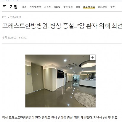 자궁내막암 3기, 박지혜 환우님의 희망일지 ep_1 | 포레스트 환우 이야기 2024.08.08 자궁내막암 3기, 박지혜 환우님의 희망일지 ep_2 | 포레스트 환우 이야기 2024.08.08 자궁내막암 3기, 박지혜 환우님의 희망일지 ep_3 | 포레스트 환우 이야기 2024.08.08 폐암 4기(비소세포암), 서중원 환우님의 희망일지 ep_1 | 포레스트 환우 이야기 2024.08.08 폐암 4기(비소세포암), 서중원 환우님의 희망일지 ep_2 | 포레스트 환우 이야기 2024.08.08 폐암 4기(비소세포암), 서중원 환우님의 희망일지 ep_3 | 포레스트 환우 이야기 2024.08.08 Hot [메디소비자뉴스]포레스트한방병원, 입원환자 '해산물 페스티벌'… 면역력 강화 코로나19 감염 예방위해…이대연 병원장 "병동 면회 제한, 병원 출입 시 소독ㆍ체온 검사" 코로나19 사태가 장기화에 접… 2021.05.18 Hot [한의신문]“연구와 임상 연계 선순환 체계 구축…한의학 현대화 앞장설 것” 이대연 원장, SCI급 학술지 심사위원으로 활동 암·근골격계 질환 한약물 유효성분 연구 분야 심사 여성암종 치료 한약물질 … 2021.05.18 Hot [뉴스1]포레스트한방병원 ‘한방 항암보조치료’ SCI급 논문 등재 이대연 병원장, 사물탕 조혈·면역 기능 메커니즘 규명 포레스트한방병원 이대연 병원장이 사물탕의 조혈, 면역 기능 메커니즘에 … 2021.05.18 Hot [일간투데이]샛노란 얼굴의 췌장암 말기, 이미 늦었나요? [일간투데이 양보형 기자] 60대 남성 A씨는 양치질을 하며 거울에 비친 샛노란 얼굴에 건강을 걱정하기 시작했다. 요즘 종종 … 2021.05.18 Hot [한국경제] 포레스트한방병원 이대연 병원장, SCI 논문 심사위원 위촉 포레스트한방병원 이대연 병원장이 SCI 학술지 중 암 관련 해외 학회지 ‘Anti-Cancer Agents in Medicin… 2021.05.18 Hot [이투데이]포레스트한방병원, 병상 증설...“암 환자 위해 최선 다해 진료하겠다” 잠실 포레스트한방병원이 환자 증가로 인해 병상을 증설, 확장 개원했다. 지난해 5월 첫 진료를 시작한 이후 8개월 만에 병상 … 2021.05.18 Hot [오가닉라이프신문] 포레스트한방병원, 힐링프로그램 운영 포레스트한방병원이 운영하고 있는 ‘힐링프로그램’이 환자들을 대상으로 높은 호응을 얻고 있다. 포레스트한방병원의 힐링프로그… 2021.05.18 Hot [산업일보]허리 ‘찌릿’하다면, 바로 병원 가야하는 신호 평소 앉아서 업무를 하는 사무직은 잘못된 자세와 습관으로 인해 허리 통증을 느낄 때가 많다. 소위 ‘디스크’라고 알려진 추간판… 2021.05.18 Hot [폴리뉴스]유상철 감독도 걸린 생존율 11% ‘췌장암’, 해결법은? 2002년 월드컵 4강 신화의 주역 유상철 감독이 얼마 전 췌장암 4기 투병 소식을 전하면서 안타까움을 더했다. 췌장암은 발견… 2021.05.18 2627282930 Search 검색대상 제목 내용 제목+내용 회원아이디 회원아이디(코) 글쓴이 글쓴이(코) 검색어 필수