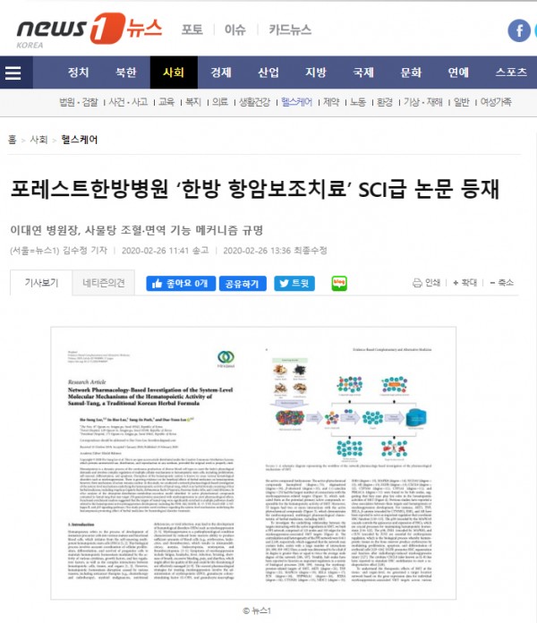 [뉴스1]포레스트한방병원 ‘한방 항암보조치료’ SCI급 논문 등재