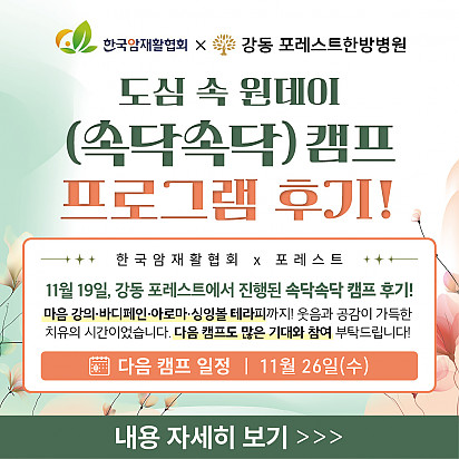 자궁내막암 3기, 박지혜 환우님의 희망일지 ep_1 | 포레스트 환우 이야기 2024.08.08 자궁내막암 3기, 박지혜 환우님의 희망일지 ep_2 | 포레스트 환우 이야기 2024.08.08 자궁내막암 3기, 박지혜 환우님의 희망일지 ep_3 | 포레스트 환우 이야기 2024.08.08 폐암 4기(비소세포암), 서중원 환우님의 희망일지 ep_1 | 포레스트 환우 이야기 2024.08.08 폐암 4기(비소세포암), 서중원 환우님의 희망일지 ep_2 | 포레스트 환우 이야기 2024.08.08 폐암 4기(비소세포암), 서중원 환우님의 희망일지 ep_3 | 포레스트 환우 이야기 2024.08.08 Hot 강동 포레스트, 원예 힐링클래스 후기 강동 포레스트는 11월 24일, 환우분들과 함께 원예 힐링클래스를 진행했습니다. 작은 화분 속 초록빛을 손끝으로 느끼며… 2025.11.27 Hot [건강정보]독감, 감기와 달라요! 감기와 독감, 비슷해 보여도 원인·증상·진행 속도 모두 다르다는 사실 알고 계셨나요? 이번 영상에서는 두 질환의 차이를 딱 … 2025.11.25 Hot 강동 포레스트에서 진행된 속닥속닥 캠프 후기! 11월 19일 강동 포레스트에서 진행된 속닥속닥 캠프! 환우분들의 따뜻한 참여로 더욱 빛났습니다. 마음 강의부터 바디… 2025.11.21 Hot 암환우 힐링 프로그램 ‘속닥속닥 캠프’ OPEN! 한국암재활협회 × 포레스트 암환우 힐링 프로그램 ‘속닥속닥 캠프’ OPEN! 암 치료 과정에서 지친 마음을 회복… 2025.11.21 Hot 암 환자의 절반 이상이 겪는 숨은 적, ‘악액질’. 암 환자의 절반 이상이 겪는 숨은 적, ‘악액질’. 단순히 살이 빠지는 문제가 아니라, 근육이 소모되고 체력이 급격히 떨어지… 2025.11.13 Hot 포레스트 항암식이팀, 2025 코리아 월드푸드 챔피언십 환경부장관상(대상) 수상! 두구두구두구 포레스트 식이 Chef팀이 2025 Korea World Food Championship 라이… 2025.11.04 Hot 포레스트의 악액질(Cachexia) 검사와 치료 암 진단을 받고 항암치료 중이거나 수술 후 요양 중이신 분들이라면 잘 먹어도 갑자기 몸무게가 확 빠지는 경험이 있… 2025.10.30 Hot 강동 포레스트 윷놀이 대회 후기 함께 웃고, 함께 즐긴 하루! 10월 2일, 포레스트 강동점에서는 환우분들과 임직원 선생님들이 청팀과 백팀으로 나뉘어 즐… 2025.10.16 Hot 강동 포레스트 10월 힐링프로그램 10월 힐링프로그램을 소개합니다! 여러분 풍성한 한가위 연휴 잘 보내셨나요? 선선한 바람이 불어오는 10월, 한층 깊… 2025.10.14 12345 Search 검색대상 제목 내용 제목+내용 회원아이디 회원아이디(코) 글쓴이 글쓴이(코) 검색어 필수