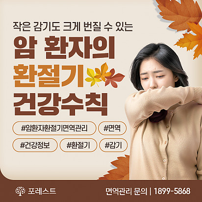 자궁내막암 3기, 박지혜 환우님의 희망일지 ep_1 | 포레스트 환우 이야기 2024.08.08 자궁내막암 3기, 박지혜 환우님의 희망일지 ep_2 | 포레스트 환우 이야기 2024.08.08 자궁내막암 3기, 박지혜 환우님의 희망일지 ep_3 | 포레스트 환우 이야기 2024.08.08 폐암 4기(비소세포암), 서중원 환우님의 희망일지 ep_1 | 포레스트 환우 이야기 2024.08.08 폐암 4기(비소세포암), 서중원 환우님의 희망일지 ep_2 | 포레스트 환우 이야기 2024.08.08 폐암 4기(비소세포암), 서중원 환우님의 희망일지 ep_3 | 포레스트 환우 이야기 2024.08.08 Hot 자연이 주는 보약, 제철 식단 자연이 주는 보약, 제철 식단 가을에 나는 음식은 가을에 먹어야 합니다. 가장 영양이 풍부한 제철 식재료로 몸… 2025.10.10 Hot [강동] 10월 추석 맞이 이벤트와 특식 긴 추석 연휴 동안 환우분들께서 강동 포레스트한방병원에서 즐겁고 따뜻한 시간을 보내실 수 있도록 다양한 이벤트… 2025.09.26 Hot 포레스트 10월 휴진 안내 안녕하세요, 포레스트입니다. 다가오는 10월 강동점 휴진 일정을 미리 알려드리오니 내원과 예약에 참고하시길 바랍니다. &… 2025.09.22 Hot 작은 감기도 크게 번질 수 있는 암 환자의 환절기 건강수칙 작은 감기도 크게 번질 수 있는 암 환자의 환절기 건강수칙 환절기에는 큰 일교차와 건조한 공기로 호흡기 질환이 늘어나… 2025.09.17 Hot 포레스트 강동점 쿠킹클래스 소식 건강한 한 입, 직접 만들어보는 즐거움! ???? 강동점 쿠킹클래스에서 진행한 영양 가득 메밀김밥 만들기 ???? … 2025.09.12 Hot 포레스트 힐링 운동 프로그램 포레스트는 환우분들의 건강한 일상을 위해 운동 프로그램을 운영하고있습니다.✅ 왜 운동이 필요할까요?항암 치료 과정에서의 기력 … 2025.09.09 Hot 9월 힐링 프로그램 9월 힐링프로그램을 소개합니다! 길어지는 가을밤의 시작, 밤과 낮의 균형을 이루는 추분. 아름다운 계절 가… 2025.08.29 Hot 포레스트 강동점 쿠킹클래스 소식 상큼한 한 입, 건강을 담은 특별한 레시피! 강동점 쿠킹클래스에서 진행한 상큼달콤 토마토 유자절임 … 2025.08.21 Hot 강동 포레스트한방병원 권오빈 병원장님,『표면해부학과 근육촉진』출간! 강동 포레스트한방병원 권오빈 병원장님, 『표면해부학과 근육촉진』 출간! 강동 포레스트한방병원 권오빈 병원장님이 임상 경험과… 2025.08.18 12345 Search 검색대상 제목 내용 제목+내용 회원아이디 회원아이디(코) 글쓴이 글쓴이(코) 검색어 필수