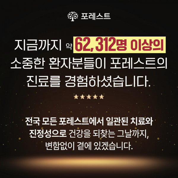 포레스트, 늘 곁에 있는 치료의 이름 안녕하세요 포레스트입니다. 지금까지 약 62,312명 이상의 소중한 환자분들이 포레스트의 진료를 경험하셨습니다. 전국 모든 포레스트에서 일관된 치료와 진정성으로 건강을 되찾는 그날까지, 변함없이 곁에 있겠습니다:)♥ ✅ 문의 전화 : 포레스트 1899-5868 ✅ 유튜브 : ‘포레스트병원’ 검색 목록