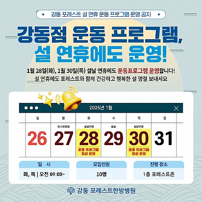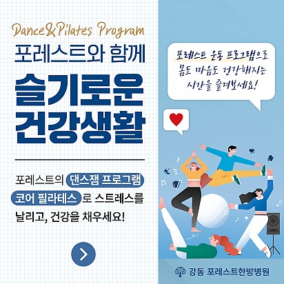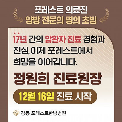 자궁내막암 3기, 박지혜 환우님의 희망일지 ep_1 | 포레스트 환우 이야기 2024.08.08 자궁내막암 3기, 박지혜 환우님의 희망일지 ep_2 | 포레스트 환우 이야기 2024.08.08 자궁내막암 3기, 박지혜 환우님의 희망일지 ep_3 | 포레스트 환우 이야기 2024.08.08 폐암 4기(비소세포암), 서중원 환우님의 희망일지 ep_1 | 포레스트 환우 이야기 2024.08.08 폐암 4기(비소세포암), 서중원 환우님의 희망일지 ep_2 | 포레스트 환우 이야기 2024.08.08 폐암 4기(비소세포암), 서중원 환우님의 희망일지 ep_3 | 포레스트 환우 이야기 2024.08.08 Hot [설 연휴에도 함께해요! 강동 포레스트 운동 프로그램 정상 운영] 안녕하세요! 강동 포레스트한방병원입니다:) 다가오는 설 연휴 동안도 여러분의 건강한 일상을 응원하기 위해 운동 프로그램을 정… 2025.01.21 Hot 강동 포레스트한방병원 Dance, Pilates Program 건강한 몸과 마음을 위해 특별한 시간을 선물하세요! 댄스잼과 코어 필라테스 프로그램으로 스트레스를 날리고 활력을 가득 채워보… 2025.01.16 Hot 포레스트 환우분들을 위한 따뜻한 도서 추천 포레스트 환우분들을 위한 따뜻한 도서 추천 건강과 회복의 여정에서 힘이 되어줄 책들을 준비했습니다. 포레스트가 추천하는 도… 2025.01.15 Hot [약채선] 체온 1도 차이가 건강을 바꾼다! 면역력 폭발 제철 항암 식재료, 생강 안녕하세요, 여러분 겨울철, 우리의 몸은 낮아진 체온으로 면역력이 약해지기 쉽습니다. 그런데 체온이 1도만 올라가도 암세포의… 2025.01.07 Hot [건강정보] 파킨슨, 파킨슨증후군, 치매 차이를 알고 계신가요? 파킨슨병, 파킨슨 증후군, 치매. 이름은 익숙하지만 정확히 구분하시나요? 이 영상에서 노년기에 흔히 나타나는 세 가지… 2025.01.02 Hot [강동]1월 힐링프로그램 안녕하세요, 포레스트입니다! 오늘은 2024년 마지막 날입니다. 한 해 잘 마무리하시고 2025년 힐링 프로그램과 함께 새… 2024.12.31 Hot [건강정보]섬망 증상에 대해 알려드립니다! 섬망과 치매, 둘 다 인지 기능에 문제를 일으키지만 전혀 다른 질환입니다! 섬망은 갑작스럽게 나타나며, 원인을 치료하면… 2024.12.26 Hot [힐링프로그램] 원데이 클래스: 나만의 캔들 만들기 강동 원데이 클래스: 나만의 캔들 만들기 강동 포레스트한방병원에서 따뜻한 연말 분위기를 선사할 특별한 클래스가 열렸습니다! … 2024.12.19 Hot 강동 포레스트 의료진 양방 전문의 명의 초빙 [정원희 진료원장] 안녕하세요! 17년간 암 환자와 함께하며 따뜻한 마음으로 희망을 전해온 정원희 진료원장님이 이제 강동 포레스트한방병원에서 진… 2024.12.17 678910 Search 검색대상 제목 내용 제목+내용 회원아이디 회원아이디(코) 글쓴이 글쓴이(코) 검색어 필수