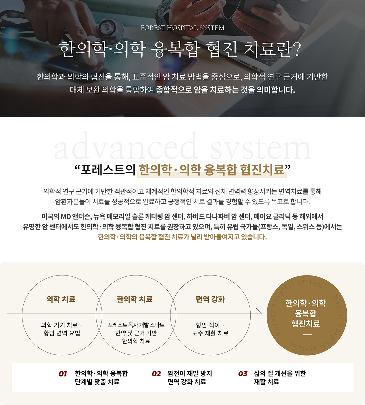 항암 면역 강화 프로그램 암전이·재발 예방, 항암·방사선 치료 후유증 관리, 낮아진 면역력 회복, 남아 있을 수 있는 미세 잔존암 사멸을 위한 한의학·의학 협진 치료가 필요합니다. · 한방항암보조요법암세포의 증식을 억제하고, 사멸을 촉진시키는 항암보조치료 · 항암면역강화요법항암면역력을 강화·암전이 재발을 억제하기 위한 치료 · 고주파온열 암 치료암세포 사멸을 촉진하고 화학·방사선의 효과를 높이는 치료 · 체력증강요법항암요법 이후에 저하된 체력 및 신체기능을 개선하는 치료 · 기타한방항암케어요법 TAF 프리미엄 농축액 TAF약침·TAF스마트캡슐 면역약침·면역스마트캡슐 포레 삼귀용탕 포레환 고주파온열 암 치료 싸이모신알파1·미슬토·이뮤노시아닌