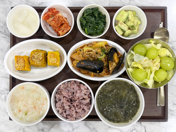 야채죽 / 잡곡밥 / 들깨미역국 / 차돌짬뽕볶음 /