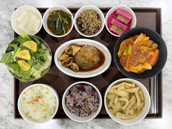 야채죽 / 잡곡밥 / 유부장국 / 함박스테이크 /