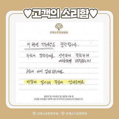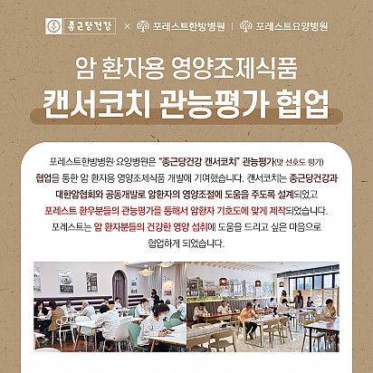 Hot 23년 8월 외래진료시간안내 23년 8월 외래진료시간안내 2023.08.01 Hot 포레스트 “종근당건강 캔서코치” 관능평가(맛 선호도 평가) 협업 포레스트한방병원·요양병원은 “종근당건강 캔서코치” 관능평가(맛 선호도 평가) 협업을 통한 암 환자용 영양조제식품 개발에 기여했… 2023.07.26 Hot 몸바로 맘쉬기 강남 포레스트요양병원 최문석 원장님과 함께하는 "몸바로 맘쉬기" 힐링프로그램을 소개합니다. 몸바로 맘쉬기 프로그램… 2023.07.20 Hot 고객의 소리함 포레스트한방병원 강동, 포레스트요양병원 강남에 전달 된 고객의 소리함 내용입니다. 1. 이현경 간호사님을 칭찬합니… 2023.07.18 Hot 포레스트 평창 전용농장 포레스트 건강한 식단의 비결은 평창농장에 신선한 유기농 식재료에서 나옵니다. 암 환자에게 음식이란 치료만큼이나 중요합니… 2023.07.14 Hot 포레스트만의 특별한 컨시어지 서비스 포레스트에서 제공하는 특별한 컨시어지 서비스를 누려보세요! - 전자기기 사용법 - 메일전송 - 인쇄 및 복사 등의 생활… 2023.07.11 Hot 7월 힐링프로그램 포레스트 7월의 힐링프로그램 소식입니다. 7월에는 포레스트한방병원 강동에 새롭게 추가된 항암 영양교육도 들어 보실 수 … 2023.07.05 Hot 2023년 7월 외래진료 시간안내 포레스트 2023년 7월 외래진료시간표 2023.07.01 Hot 포레스트 2년 연속 보건복지부 장관 대상 수상 한국농수산식품유통공사에서 주최한 2022, 2023년 "대한민국 국제요리 & 제과경연대회"에서 포레스트 식이 Chef팀은 … 2023.06.27 1112131415 Search 검색대상 제목 내용 제목+내용 회원아이디 회원아이디(코) 글쓴이 글쓴이(코) 검색어 필수