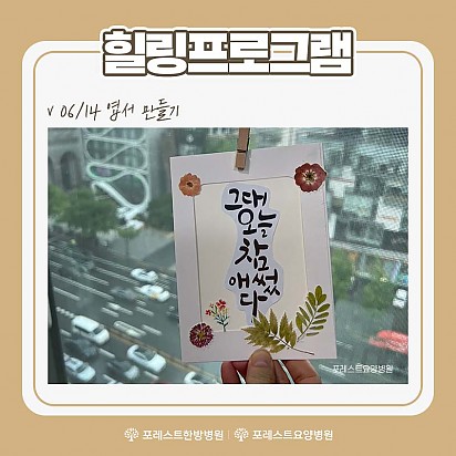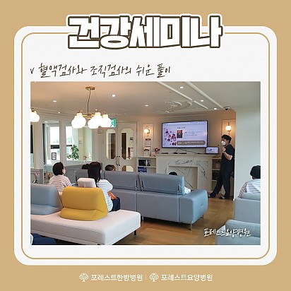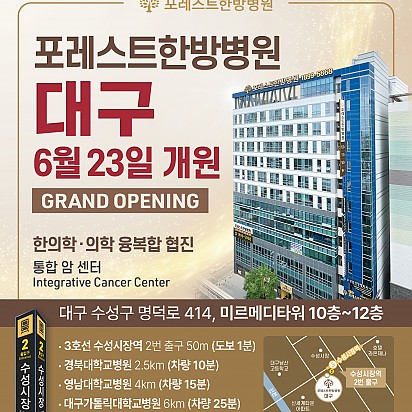 Hot 포레스트한방병원 대구 오픈 포레스트한방병원 대구점이 성황리에 Grand Open했습니다. 이제 포레스트를 "대구"에서도 만나보실수 있습니다. … 2023.06.23 Hot 힐링프로그램 DIY 지난주! 포레스트한방병원 강동 포레스트요양병원 강남에서 진행 된 진행된 포레스트 힐링프로그램입니다~!! - 캘리그라피… 2023.06.20 Hot 건강 세미나 지난주 포레스트한방병원 강동, 포레스트요양병원 강남에서는 혈액검사와 조직검사의 쉬운 풀이라는 주제로 포레스트환우분들을 위한… 2023.06.13 Hot 6월 힐링프로그램 안내 포레스트의 6월 힐링프로그램 안내입니다. ^^ 알짜배기 정보들을 알아보는 이대연 대표 병원장님의 건강 세미나와 맛있는 건… 2023.06.05 Hot 2023년 6월 외래진료 시간안내 포레스트 2023년 6월 외래진료시간표 2023.06.01 Hot 2023년 6월 외래진료 시간안내 포레스트 2023년 6월 외래진료시간표 2023.06.01 Hot 런닝머신 신규설치 포레스트한방병원 강동, 포레스트요양병원 강남점에 런닝머신이 신규 설치되었습니다~!! 런닝머신 운동은 심장과 폐의 기능… 2023.05.31 Hot 포레스트존 안마의자 포레스트한방병원·포레스트요양병원 포레스트존에 환우님들의 힐링을 위한 안마의자가 새로 설치되었습니다! 포근한 안마의자에서 … 2023.05.25 Hot 2023년 대한민국 국제 요리경연대회 3관왕 #포레스트수상 2023년 5월 21일(일), aT센터에서 진행 된 2023년 대한민국 국제 요리경연대회에 포레스트 식이 … 2023.05.22 1112131415 Search 검색대상 제목 내용 제목+내용 회원아이디 회원아이디(코) 글쓴이 글쓴이(코) 검색어 필수