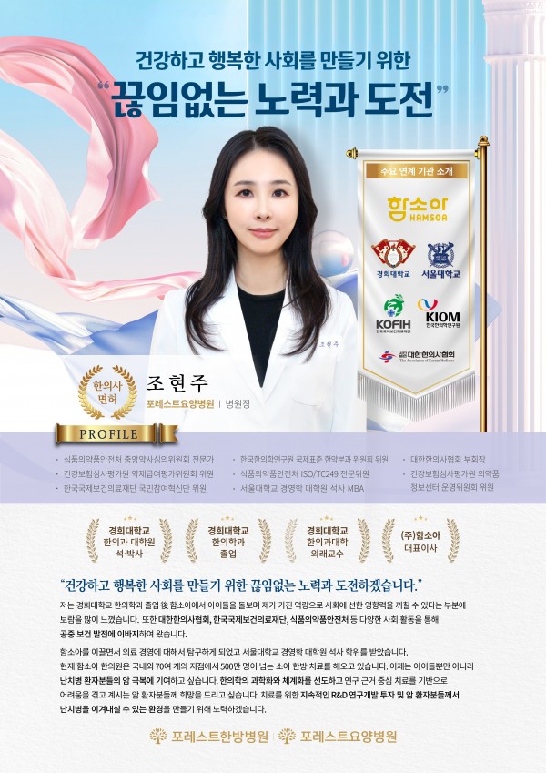포레스트요양병원 조현주병원장 ☑조현주 포레스트요양병원 | 병원장 건강하고 행복한 사회를 만들기 위한 "끈임없는 노력과 도전하겠습니다" 한의학의 과학화와 체계화를 선도하고 연구 근거 중심 치료를 기반으로 어려움을 겪고 계시는 암 환자분들께 희망을 드리고 싶습니다. 치료를 위한 지속적인 R&D 연국개발 투자 및 암 환자분들께서 난치병을 이겨내실 수 있는 환경을 만들기 위해 노력하겠습니다. 목록