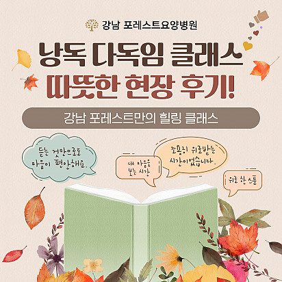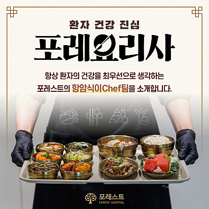 Hot 포레스트의 항암식이Chef팀을 소개합니다. 시즌1에 이어서 큰 이슈가 되고 있는 흑백요리사 시즌2 다들 시청 중이신가요? 포레스트에도 특급호텔, 미슐랭 2스타 출신 등… 2025.12.31 Hot 2026년, 새해 복 많이 받으세요! 지난 한 해 동안 포레스트와 회복의 여정을 함께해 주셔서 진심으로 감사드립니다 2026년 병오년, 붉은 … 2025.12.30 Hot 포레스트 크리스마스 면역 식탁 여러분, 크리스마스는 따뜻하게 보내셨나요? 12월 25일, 포레스트에서는환우분들의 건강과 회복을 응원하는풍성한 크리스… 2025.12.26 Hot [건강정보] 두통에 도움되는 간단한 지압법 소개드립니다. 안녕하세요, 포레스트입니다! ????오늘은 두통에 자주 시달리시는 분들을 위해하루 1분! 가벼운 두통이 있을 때 하면 좋을 지… 2025.12.10 Hot [건강정보]독감, 감기와 달라요! 감기와 독감, 비슷해 보여도 원인·증상·진행 속도 모두 다르다는 사실 알고 계셨나요? 이번 영상에서는 두 질환의 … 2025.11.25 Hot 암환우 힐링 프로그램 ‘속닥속닥 캠프’ OPEN! 한국암재활협회 × 포레스트 암환우 힐링 프로그램 ‘속닥속닥 캠프’ OPEN! 암 치료 과정에서 지친 마음을 회복… 2025.11.21 Hot 강남 포레스트 ‘낭독 다독임 클래스’ 따뜻한 현장 후기 강남 포레스트요양병원의 힐링 프로그램 중 많은 분들의 사랑을 받고 있는 ‘낭독 다독임 클래스’ 따뜻한 현장 후기를 소개드립… 2025.11.18 Hot 암 환자의 절반 이상이 겪는 숨은 적, ‘악액질’ 암 환자의 절반 이상이 겪는 숨은 적, ‘악액질’. 단순히 살이 빠지는 문제가 아니라, 근육이 소모되고 체력이 급격히 떨어지… 2025.11.13 Hot 강남점 낭독프로그램 작가 소개 강남 포레스트요양병원에서는 마음의 쉼표를 만드는 낭독 다독임 클래스가 진행 중입니다. 오늘은 함께해주시는 **낭독 작가 ‘… 2025.11.12 12345 Search 검색대상 제목 내용 제목+내용 회원아이디 회원아이디(코) 글쓴이 글쓴이(코) 검색어 필수