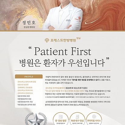 Hot 위클리피플 인터뷰 지난 18일! 위클리피플의 포레스트 한방병원 이대연 대표 병원장님 인터뷰가 있었습니다. :) 위클리피플은 사회 주요분야의… 2022.03.08 Hot PCR장비 신규 도입 포레스트한방병원원 PCR(유전자증폭검사) 장비 신규 도입으로 코로나 자체 검사를 진행합니다. 앞으로도 환자, 보호자, 임직원… 2022.03.08 Hot 포레스트한방병원 연탄기부 봉사활동 안내 “포레스트한방병원과 더나은간호협회가 함께한, 사회 나눔으로 따뜻한 겨울, 연탄 기부 봉사 활동” 이번 겨울 포레스트한방병… 2022.03.08 Hot 포레스트한방병원 설 명절 특식 안내 "설맞이 명절 음식은 포레스트한방병원과 함께 하세요." 포레스트한방병원 광화문본점, 잠실점에서 전문쉐프들이 환우분들을 … 2022.01.26 Hot 포레스트한방병원 잠실점 정민호 병원장 소개 " Patient First 병원은 환자가 우선입니다 " 어릴적 잔병치레가 많아 병원 출입이 잦았는데, 불친절하고 권위… 2022.01.26 Hot 잠실 포레스트한방병원 의료진과 특급쉐프진이 함께하는 금주의 약선요리 잠실 포레스트한방병원 의료진과 특급쉐프진이 함께하는 금주의 약선요리 안내: ) 9월 28일 약선더덕제육볶음 9월 3… 2021.09.28 Hot 잠실 포레스트한방병원 의료진과 특급쉐프진이 함께하는 금주의 약선요리 잠실 포레스트한방병원 의료진과 특급쉐프진이 함께하는 금주의 약선요리 안내: ) 9월 15일 한방 동파육 9월 17일… 2021.09.15 Hot KT가 자사 정보통신기술(ICT) 기술을 접목해 호텔급 서비스를 제공하는 스마트 한방병원을 조성했다 KT가 자사 정보통신기술(ICT) 기술을 접목해 호텔급 서비스를 제공하는 스마트 한방병원을 조성했다. KT는 포레스트한방… 2021.08.04 Hot 코로나19 확산에 따른 입원환자 및 상주 보호자 협조 안내 코로나19 확산에 따른 입원환자 및 상주 보호자 협조 안내 입니다. 2021.07.14 2122232425 Search 검색대상 제목 내용 제목+내용 회원아이디 회원아이디(코) 글쓴이 글쓴이(코) 검색어 필수