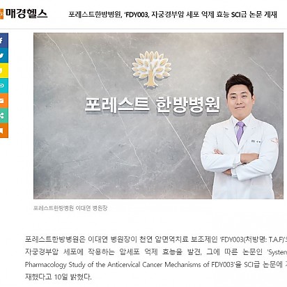 Hot 포레스트 광화문점 오픈기념 입원/외래 프로모션 기간 : 6/28~7/31 광화문점/잠실점 첫 방문시 : 면역캡슐 10ea 또는 녹용보혈탕 10ea 2021.06.29 Hot 포레스트한방병원 연구소 국가연구개발사업 연구과제 최종선정 포레스트한방병원 연구소는 “IT-BT융합 시스템 생물학 기술을 활용한 최적 유방암 항암한약제제 개발 연구” 한국연구재단 … 2021.06.09 Hot 포레스트한방병원 별관 확장 그랜드오픈 포레스트한방병원은 최상의 의료 서비스를 위해 별관을 확장 오픈 하였습니다. 3월22일 GRAND O… 2021.05.18 Hot 포레스트 한방병원, 정민호 병원장과 함께 제2의 도약 선언 포레스트 한방병원은 3월부터 정민호 병원장 운영 아래 연구하는 한방병원으로 다져온 입지를 더욱 공고히 하기 위해 힘쓰고 있다.… 2021.05.18 Hot 폐암 세포에 대한 생약복합물 ‘FDY2004(처방명: T.A.F2)’의 암세포 억제 효능 매경헬스 2021.05.18 Hot 포레스트한방병원 이대연 병원장이 유방암세포에 대한 암면역치료 생약복합물 ‘FDY003(처방명: T.A.F)’의 암세포 억제 효 [헤럴드경제] 포레스트한방병원 이대연 병원장이 유방암세포에 대한 암면역치료 생약 보조제 ‘FDY003(처방명: T.A.F)’의… 2021.05.18 Hot 설 맞이 프로모션 설날을 맞아 포레스트한방병원에서 환우님과 가족 모두의 건강을 위한 '약 프로모션'을 준비하였습니다 ^^ (준비된 … 2021.05.18 Hot [머니투데이방송] 포레스트 한방병원, SCI급 국제학술지 작약감초탕 진통효능 논문 발표 작약감초탕은 근육통, 관절통, 신경통, 슬통, 요통, 암성통증 등 다양한 유형의 통증을 효과적으로 완화시키는 대표적인 통증치료… 2021.05.18 Hot 포레스트한방병원, ‘FDY003, 자궁경부암 세포 억제 효능 SCI급 논문 게재 포레스트한방병원은 이대연 병원장이 천연 암면역치료 보조제인 ‘FDY003(처방명: T.A.F)’의 자궁경부암 세포에 작용하는 … 2021.05.18 2122232425 Search 검색대상 제목 내용 제목+내용 회원아이디 회원아이디(코) 글쓴이 글쓴이(코) 검색어 필수