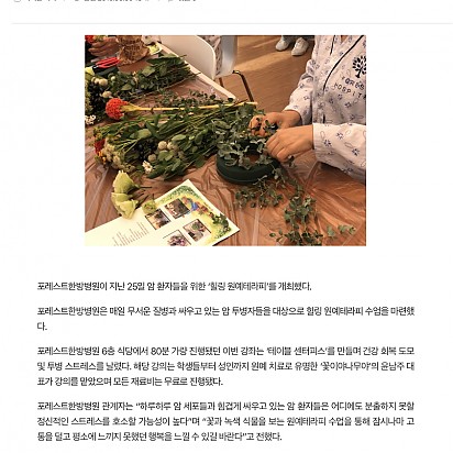 Hot [Queen] 포레스트한방병원, 암 환우들을 위한 '힐링원예테라피'개최 포레스트한방병원이 지난 25일 암 환자들을 위한 ‘힐링 원예테라피’를 개최했다. 포레스트한방병원은 매일 무서운 질병과 싸… 2021.05.18 Hot 추석연휴, 암 환우들이 주의해야 할 식단은? 암환우 추석연휴 식생활 포레스트한방병원 영양팀을 통해 추석 연휴동안 암환자가 주의해야 할 사항에 대해 알아보았습니다. … 2021.05.18 Hot 전라일보,국제뉴스,대학저널,대학신문.-원광보건대학교 임상병리과, 포레스트한방병원과 연구 및 교육협력 MOU 체결 원광보건대학교(총장 백준흠) 임상병리과가 최근 암면역치료를 제공하고 있는 포레스트한방병원과 산학협력 MOU를 체결했다고 6일 … 2021.05.18 Hot [서울 송파] 암 전문 포레스트한방병원에서 고주파온열암치료를 받아보세요 [서울 송파] 암 전문 포레스트한방병원에서 고주파온열암치료를 받아보세요 2021.05.18 Hot <메디컬투데이> 포레스트한방병원, 원광보건대와 연구 활성화 위해 산학 협력 MOU 체결 포레스트한방병원은 지난 20일 원광보건대학교와 연구, 산학 협력 MOU를 체결했다고 21일 밝혔다. 포레스트한방병원과 원… 2021.05.18 Hot <오가닉라이프신문>항암 병행 치료로 암환자 면역력 높인다 [포레스트한방병원] 자궁경부암은 자궁의 입구인 자궁경부에 발생하는 여성 생식기 암이다. 자궁경부암은 다른 암종과 다르게 비교적 발병 원인이 뚜렷한… 2021.05.18 Hot 암환자, 여름철 면역력 관리에 각별히 힘써야[포레스트한방병원] 우리 몸에는 하루에도 수 천개의 암세포가 생성된다. 그러나 모든 암세포가 다 암으로 발전하는 것은 아니다. 체내의 면역력에 의… 2021.05.18 Hot <매경헬스>포레스트한방병원, 암면역치료제 논문 SCI급 학술지 등재 암면역치료 전문 포레스트한방병원은 천연물 보조치료 약물 ‘FDY003’에 대한 연구 논문인 'Colo205 암세포를 이식한 마… 2021.05.18 Hot <한국경제>포레스트한방병원 연구 논문, SCI급 학술지 10월호 등재 확정 송파구 방이동에 위치한 포레스트한방병원의 연구 논문인 ‘Herbal Medicine FDY003 Inhibits Colon C… 2021.05.18 26 Search 검색대상 제목 내용 제목+내용 회원아이디 회원아이디(코) 글쓴이 글쓴이(코) 검색어 필수