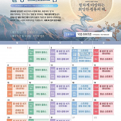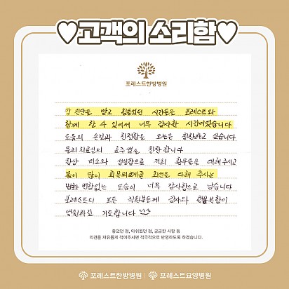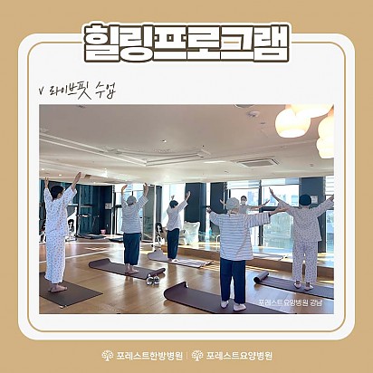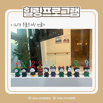 Hot 1월 힐링프로그램 포레스트의 1월 힐링프로그램을 소개합니다~! 새해를 맞이하여 더욱 재밌는 클래스들을 준비해보았습니다ㅎㅎ 포레스트의 … 2024.01.09 Hot "포레스트 암세포 자멸 유도 한약제제 한국한의약진흥원장상 수상" 지난 12월 16일, MBN "한의약 미래기술을 찾아라, K-메디슨" 방송편에서 포레스트 한의약기술이 소개되었습니다. 포… 2024.01.05 Hot 포레스트한방병원 은평점 개원 Grand opening 2024년 1월 3일, 포레스트한방병원 은평점이 성황리에 개원을 했습니다. 포레스트한방병원… 2024.01.04 Hot 크리스마스 이벤트 안녕하세요~! 모두들 즐거운 크리스마스를 보내셨는지요! 포레스트한방병원 강동과, 포레스트요양병원 강남에서는 크리스마스를 … 2023.12.26 Hot 루돌프 키링 만들기 포레스트요양병원 강남점에서 진행 된 루돌프 키링 만들기 힐링프로그램 수업입니다~! 포레스트에서는 다가오는 크리스마스를 … 2023.12.21 Hot 포레스트한방병원 은평점 개원예정 Grand opening 24년 1월, 포레스트한방병원 은평점 개원예정입니다! 차별화된 포레스트만의 진료, 서비스를… 2023.12.12 Hot 12월 힐링프로그램 어느덧 달력의 마지막 장을 넘기며 12월이 찾아왔습니다. 12월은 크리스마스를 기다리며 거리마다 반짝이는 불빛과 캐럴이 우리… 2023.12.05 Hot 라이브핏 클래스 몸도 마음도 건강해지는 라이브핏 클래스입니다! 1. 링테라피 2. 코어 필라테스 3. ABT 4. 힐링요가 를 배울수… 2023.11.23 Hot 고객의소리함 10월 마지막주 포레스트에 전달 된 고객의 소리함 내용입니다~! 포레스트에서 행복을 느끼시고 그 행복을 널리 공유해주… 2023.11.09 678910 Search 검색대상 제목 내용 제목+내용 회원아이디 회원아이디(코) 글쓴이 글쓴이(코) 검색어 필수
