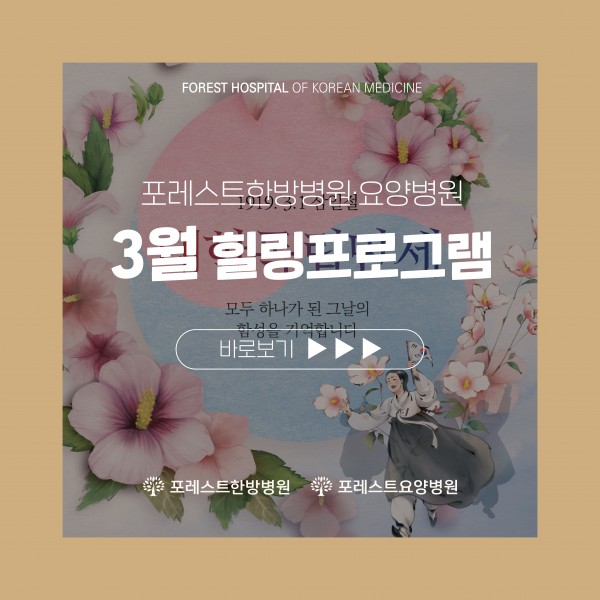 3월 힐링프로그램 포레스트의 3월 힐링프로그램을 소개합니다 :)♡ 삼일절의 기운과 시작하는 3월! 환우분들을 위해서 더욱 다양한 프로그램으로 돌아온 포레스트입니다 :)! ☆ 강남점에서 매주 토요일 특별진료와 암Q&A 시간이 새로 편성되었으니 많은 관심 부탁드립니다~ 언제나 환우분들의 몸과 마음의 힐링을 위하여 생각하고 연구하는 포레스트입니다♡ 목록