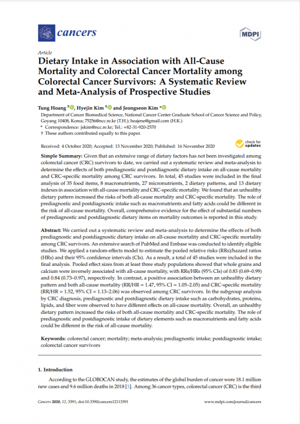 Dietary Intake in Association with All-Cause. Mortality and Colorectal Cancer Mortality among. Colorectal Cancer Survivors: A Systematic Review. And Meta-Analysis of Prospective Studies