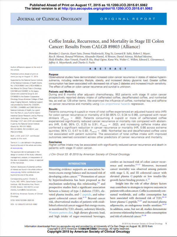 암진단 이후 1일 평균 240-360ml의 커피를 섭취한 3기 결장암 환자는 암재발률이 감소하고 생존율이 상승함. 2022.06.13 16:29 383https://sci-hub.se/10.1200/jco.2015.61.5062 암진단 이후 1일 평균 240-360ml의 커피를 섭취한 3기 결장암 환자는 암재발률이 감소하고 생존율이 상승함. Coffee Intake, Recurrence, and Mortality in Stage III Colon Cancer: Results From CALGB 89803 (Alliance) https://sci-hub.se/10.1200/jco.2015.61.5062 목록