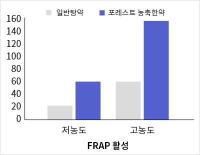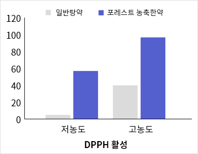포레스트 농축한약은 여러가지 기법 (DPPH, ABTS, FRAP)의 약재활성 시험결과 높은 약효 검증. 직접 복용해보시면 차이를 느끼실 수 있습니다.
