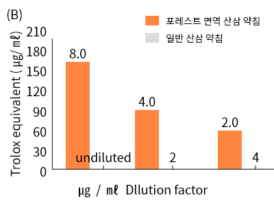 포레스트 면역 산삼 약침 일반 산삼 약침 약재활성도 비교 後 일반 산삼 약침 약재활성도 低(일부 활성도 0), 포레스트 면역 산삼 약침 약재활성도 高.