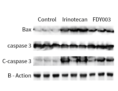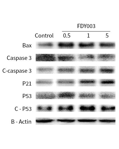 TAF(FDY003) 통한 암세포 자살신호 측정 위해 Western Blotting 실험. TAF 통한 다양한 암세포 자살신호 증가 검증.