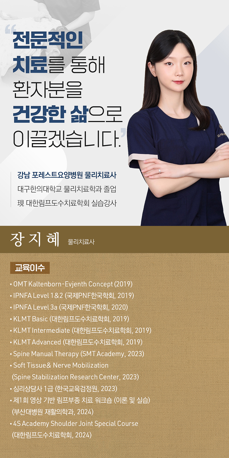 도수·물리·재활치료 수술 및 암종양에 의한 통증을 완화에 도움이 되는 도수·물리·재활치료 오랜 병상활동으로 신체활동 저하, 항암 후 근골격계 기능 저하 등 치료 전 후 다양한 후유증 치료에 도움. 체력 및 기력 저하를 해결하는데 탁월한 효과있음 도수치료는 약물을 사용하지 않는 비침습적 치료로 환자분들의 신체적 부담이 적음 도수·물리·재활치료의 장점 림프도수치료 치료사의 손에 의해 림프순환을 촉진하여 항암 관련 부작용이나 수술 후 림프절 손상으로 인해 생기는 림프순환 장애와 림프액의 축적으로 인한 부종과 통증을 치료 치료효과 림프절 혹은 림프관이 손상된 경우에도 경로를 우회하여 림프액을 흡수하고 부종 예방 교감신경의 진정 효과로 긴장완화와 림프 순환을 촉진 관문조절설에 의해 뇌로 전달하는 통증을 차단하여 통증을 경감 림프순환의 촉진으로 림프절 내의 면역세포가 활성화 정형도수치료 항암 집중 치료 후 생기는 근골격계 통증과 관절의 강직 및 운동 제한, 근육의 경직 및 단축 등 다양한 근골격계 후유증을 치료 치료효과 수술 후 유착된 결합조직이 분해, 분리되어 부드러운 상태로 복구 제한된 가동범위를 증가 시키고 근육을 강화시켜 편안한 움직임 촉진 통증이 감소되고 근육 긴장도를 낮춤 내장기도수치료 내장기 안의 내용물을 움직이고 순환시키고 내장기 주변의 긴장과 유착을 풀어주어 항암 집중 치료 후 생기는 소화불량, 복부 팽만감, 변비, 설사 등 위장장애를 치료 치료효과 수술 후 유착된 내장기 주변을 풀어주어 부드러운 정상기능 상태로 회복 소화불량, 변비 등 위장장애를 해소 운동치료 신체를 움직여 심폐기능 활성화시켜 근력 상승과 피로회복에 도움 신체 활동량을 높여 체력 향상을 이끌며 면역력 상승 효과 치료효과 뻣뻣한 근막을 신장시켜 림프순환을 촉진, 부교감 활성을 유도하여 회복에 도움 전체적인 신진대사를 촉진 예민한 감각을 줄여주어 통증 감소와 운동성 회복에 도움 물리치료 장비 PAIN JAMMER ENS-1140 | 비침습 통증 치료기 피부에 부착한 전극을 통해 뇌로 전달되는 통증 전달 경로를 무통증 신호로 바꿔주는 기구 적외선 치료기 열을 발생시켜 몸 안으로 침투하여 근육의 긴장을 풀고 혈액순환에 도움을 주는 치료장비 TENS | 경피신경자극기 통증 부위에 있는 감각 신경에 물리적 자극을 일정한 간격으로 줌으로써 뇌로 가는 통증 신호를조절해 통증을 줄이는 치료장비