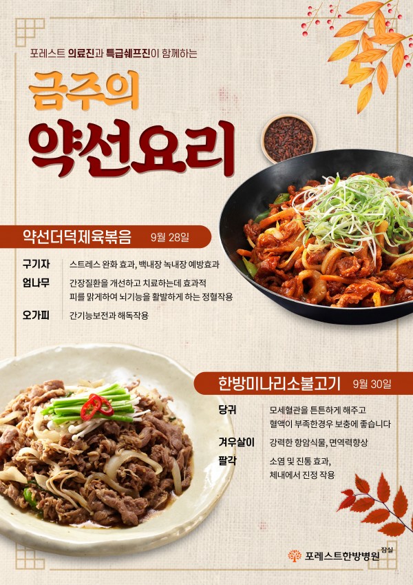 잠실 포레스트한방병원 의료진과 특급쉐프진이 함께하는 금주의 약선요리 잠실 포레스트한방병원 의료진과 특급쉐프진이 함께하는 금주의 약선요리 안내: ) 9월 28일 약선더덕제육볶음 9월 30일 한방미나리소불고기 목록