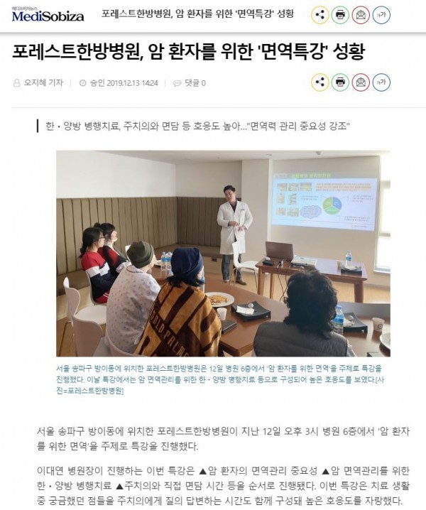 [메디소비자뉴스]포레스트한방병원, 암 환자를 위한 '면역특강' 성황