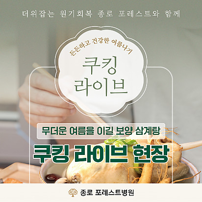 종로 포레스트병원 쿠킹 라이브 코너 공개 안녕하세요 포레스트입니다! 무더운 여름, 기력회복은 삼계탕! 종로 포레스트병원 쿠킹 라이브 코너를 공개합니다! 1.… 2025.06.12